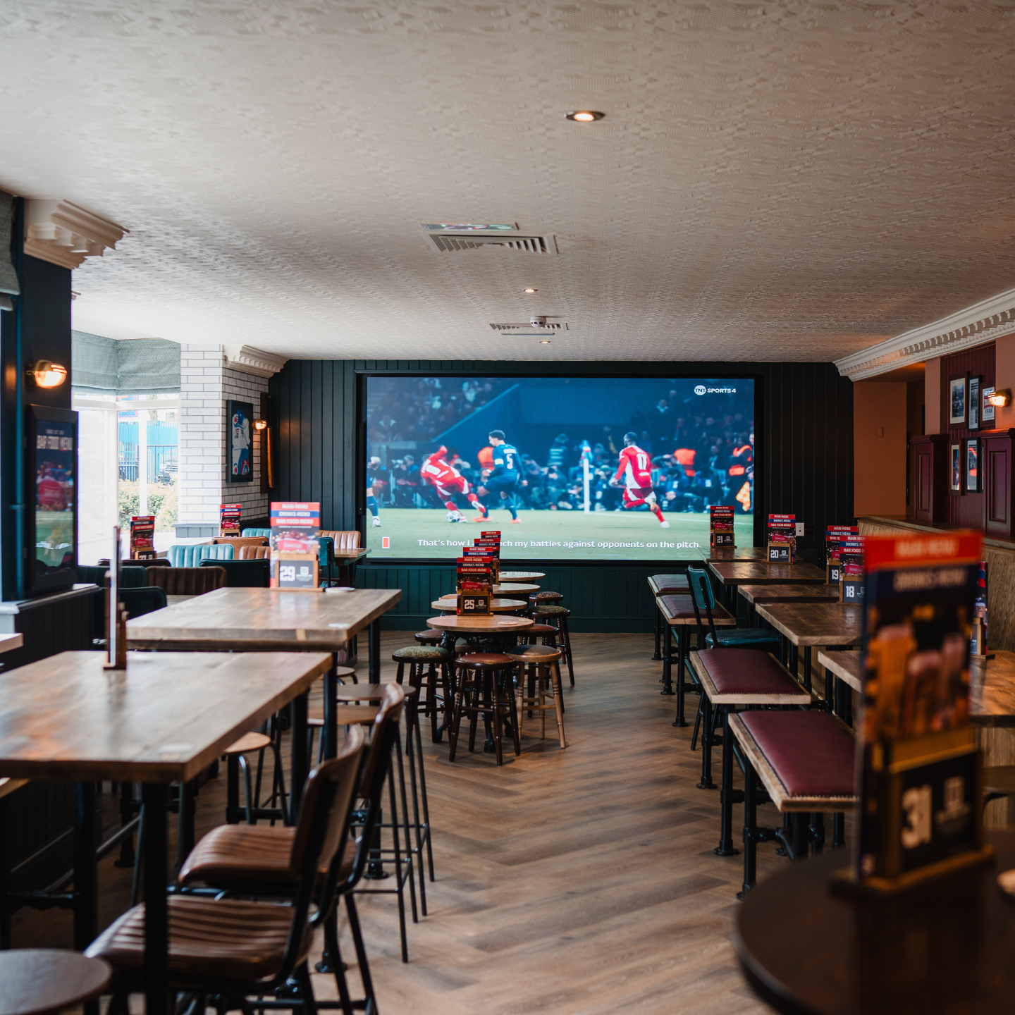 Watch it, feel it & share it like never before with our 3-metre wide, high-definition screen and goose-bump-giving subwoofer stadium sound. Football, rugby, F1, darts, horse racing… you name it, we show it. With fully immersive daily live sport, weekly live music, regulation darts and pool, 2-pinters on all draught beer from the bar and mouth-watering food, book now or pop in to your brand new local!